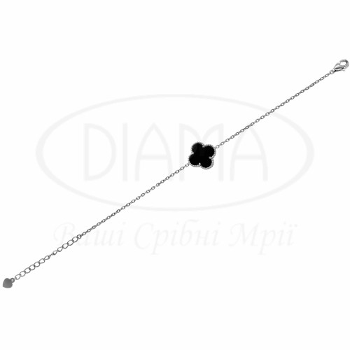 Браслет срібний з оніксом. Срібло 925 проби, покрите родієм. Браслет виготовлений в формі "Клевер". В наборі присутні каблучка, сережки, підвіска, кольє та браслет. Розмір головного елементу - 15 мм. Додатковий ланцюг надає можливість змінювати розмір.