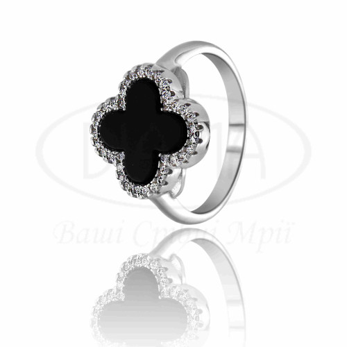 Каблучка срібна з Оніксом та білим цирконом. Срібло 925 проби, покрите родієм. Каблучка виготовлена в формі "Клевер". В наборі присутні каблучка, сережки та підвіс. Розмір головного елементу - 14 мм.