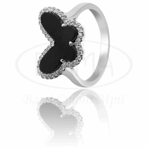 Каблучка срібна з Оніксом та білим цирконом. Срібло 925 проби, покрите родієм. Каблучка виготовлена в формі "Метелик". В наборі присутні каблучка, сережки та підвіска. Розмір метелика 17*13 мм.