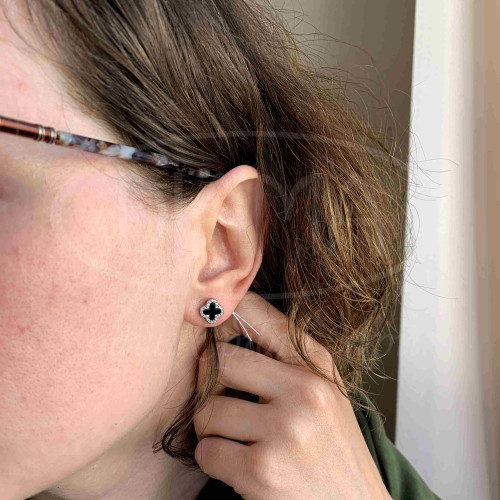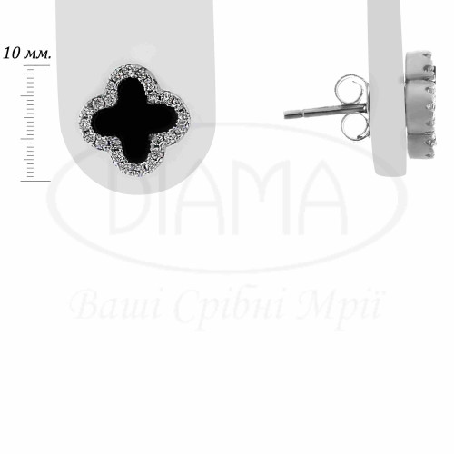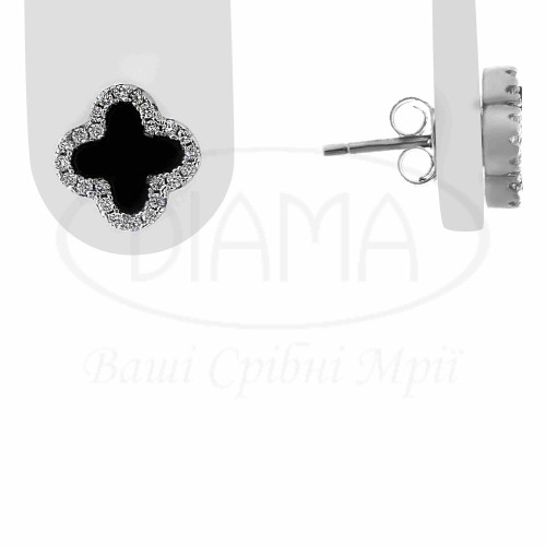 Срібні сережки пусети з Оніксом та білим цирконом. Срібло 925 проби, покрите родієм. Виготовлені в формі Конюшини. Розмір головного елементу - 10 мм.