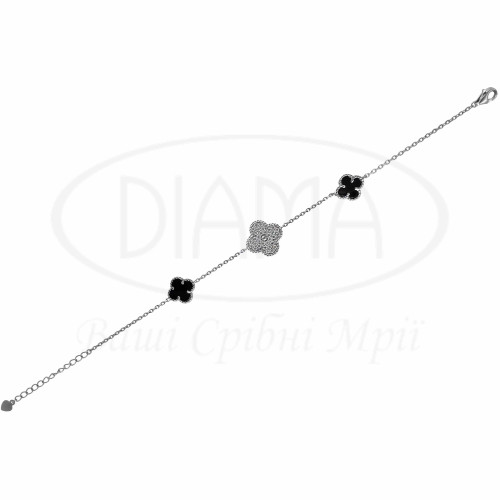 Срібний Браслет 925 проби, покритий родієм. Виготовлений в формі Конюшини. Вставка з Оніксу. В наборі також присутні срібне сережки та браслет.