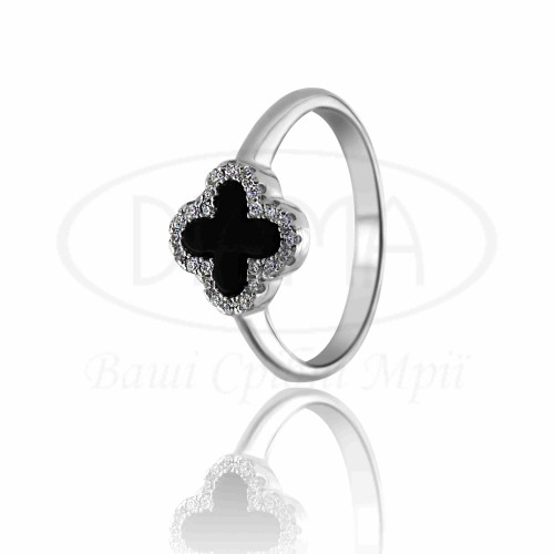Каблучка срібна з Оніксом. Срібло 925 проби, покрите родієм. Каблучка виготовлена в формі "Клевер". В наборі присутні каблучка, браслет, кольє, сережки та підвіс. Розмір головного елементу 10 мм.