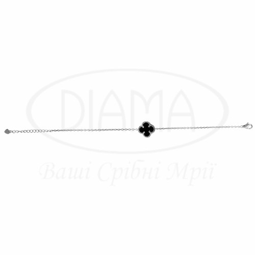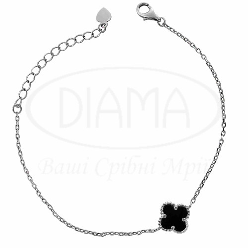Браслет срібний з Оніксом. Срібло 925 проби, покрите родієм. Виготовлено в формі "Клевер". В наборі присутні каблучка, сережки, браслет, кольє та підвіс. Розмір головного елементу 11 мм.