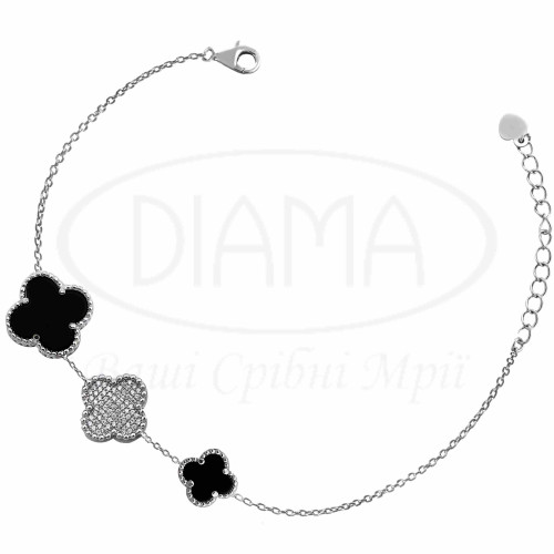 Срібний браслет з чорним оніксом і білим цирконом. Срібло 925 проби, покрите родієм. В наборі є Сережки, Кольє та Браслет. Розмір головних елементів 11 та 15 мм.