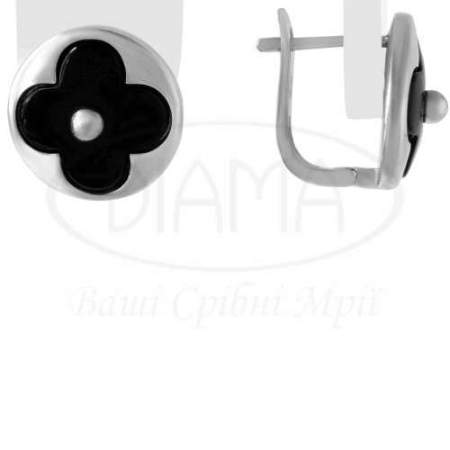Срібні сережки з клевером. Срібло 925 проби, покрите родієм. Вставка онікс. Розмір головного елементу 15 мм.