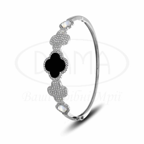 Срібний браслет з оніксом, білим перламутром та білим цирконом. Срібло 925 проби, покрите родієм. Браслет виготовлений в формі "Клевера". В наборі присутні каблучка та браслет.