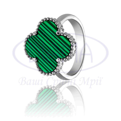 Каблучка срібна з зеленим Малахітом. Срібло 925 проби, покрите родієм. Каблучка виготовлена в формі "Клевера". Розмір головного елементу 17 мм. В наборі присутна каблучка, кольє, підвіска та сережки.
