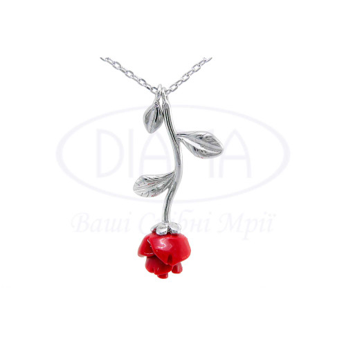Кольє срібне з прикрасою у вигляді троянди з синтетичного Коралу. Срібло 925 проби, покрите родієм. В комплекті також є браслет.