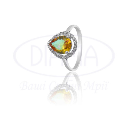 Каблучка срібна з білим цирконом та султанітом у формі краплі, який змінює відтінок при різному освітленні до зеленого, жовтого, малинового або яскраво помаранчевого. Діаметр - 12,5×11 мм. Срібло 925 проби, покрите родієм. В комплекті каблучка, сережки та підвіска.