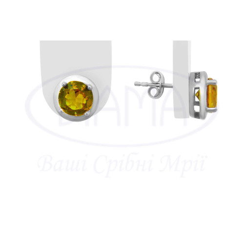 Сережки срібні з круглим султанітом, якому властиво змінювати відтінок при різному освітленні до зеленого, жовтого, малинового або яскраво помаранчевого. Срібло 925 проби, покрите родієм. Розмір камня 9,5 мм.