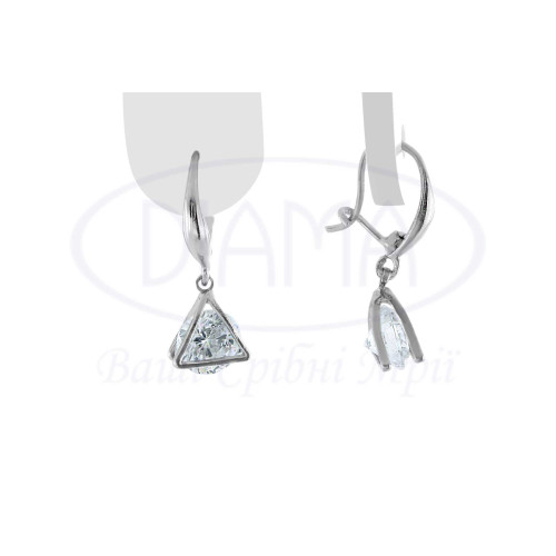 Сережки срібні з білим цирконом у формі трикутника. Срібло 925 проби, покрите родієм. Розмір трикутника 8х10 мм.