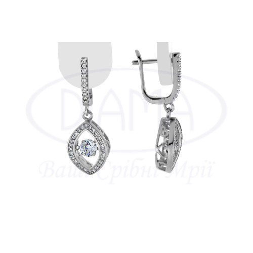 Срібні сережки з білим цирконом у формі "маркіз" та камінь який рухається. Срібло 925 проби, покрите родієм. Розмір головного елементу сережки 16х11 мм, висота 32 мм. В наборі присутні каблучка, підвіска та сережки.
