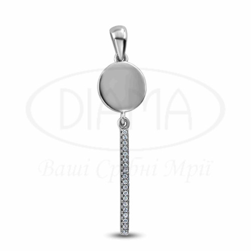 Підвіска срібна з білим цирконом у формі круга та палички. Срібло 925 проби, покрите родієм. Розмір головного елементу підвіски (Круг) 10 мм, (паличка) 23 мм. В комплекті каблучка, сережки та підвіска.