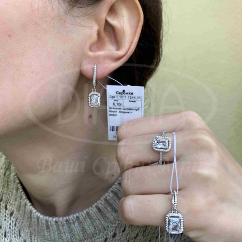 Срібна підвіска з білим цирконом у формі прямокутника. Срібло 925 проби, покрите родієм. Розмір головного елементу підвіски 9х11 мм. В наборі каблучка, підвіска та сережки.