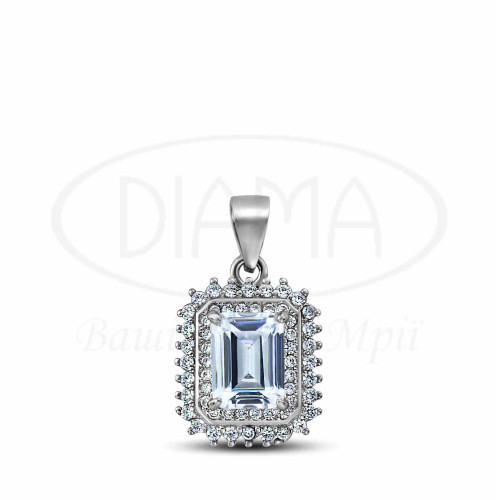 Срібна підвіска з білим цирконом у формі прямокутника. Срібло 925 проби, покрите родієм. Розмір головного елементу підвіски 12,5х14 мм. В наборі каблучка, підвіска та сережки.