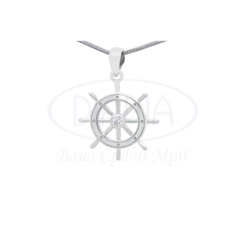 Підвіска срібна у вигляді штурвалу з білим цирконом. Срібло 925 проби, покрите родієм. В наборі є каблучка, сережки та підвіска