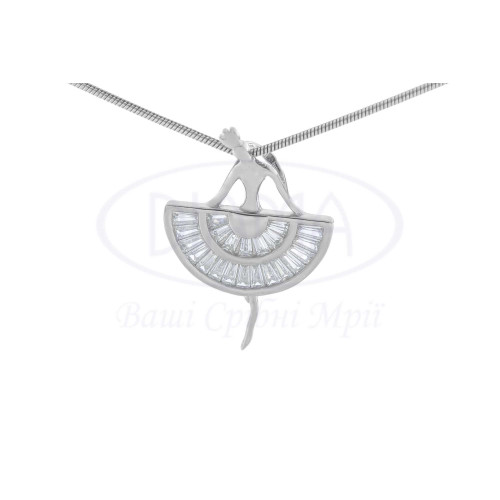 Підвіска срібна з білим цирконом, виконана у формі балерини. Срібло 925 проби, покрите родієм. Розміри балерини 18х2,8 мм. В комплекті каблучка, сережки та підвіска.