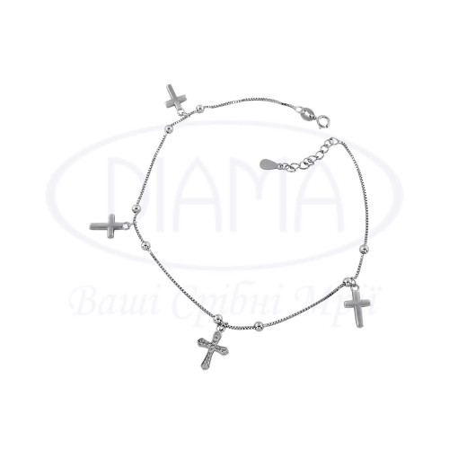 Браслет срібний на ногу з білим цирконом у формі хрестика та кульки. Срібло 925 проби, покрите родієм. Розмір хрестиків 10х15 та 8х14 мм.
