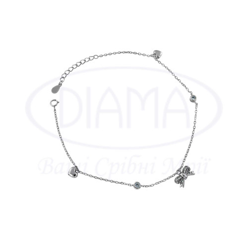 Браслет срібний на ногу з білим цирконом у формі бантика та серця. Срібло 925 проби, покрите родієм.