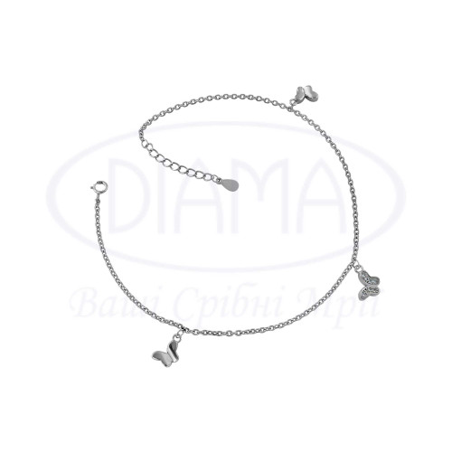 Браслет срібний на ногу з метеликами та білим цирконом. Срібло 925 проби, покрите родієм.