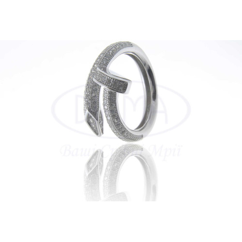 Срібна каблучка з білим цирконом, у формі зігнутого цвяха. Срібло 925 проби, покрите родієм.