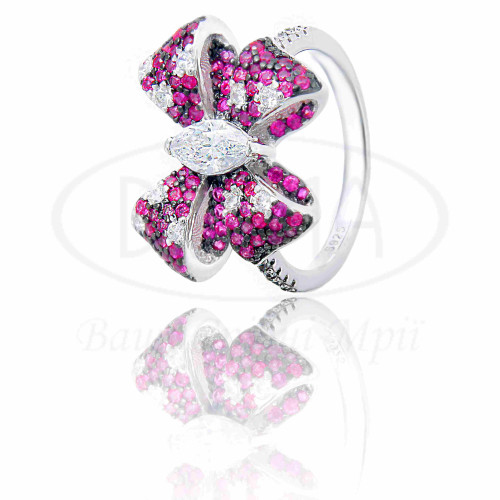 Срібна каблучка в формі "Бант" з малиновим та білим цирконом. Срібло 925 проби, покрите родієм.