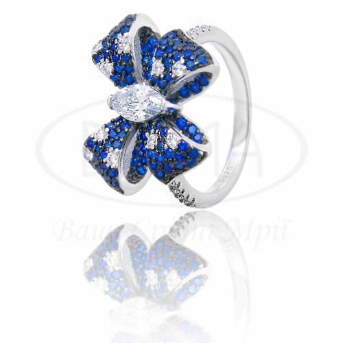 Срібна каблучка в формі "Бант" з синім та білим цирконом. Срібло 925 проби, покрите родієм.