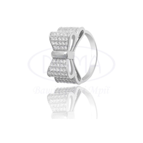 Срібна каблучка в формі "Бант" з білим цирконом. Срібло 925 проби, покрите родієм. В наборі присутні каблучка, сережки та підвіска. Розмір бантика 9,5 * 20 мм.