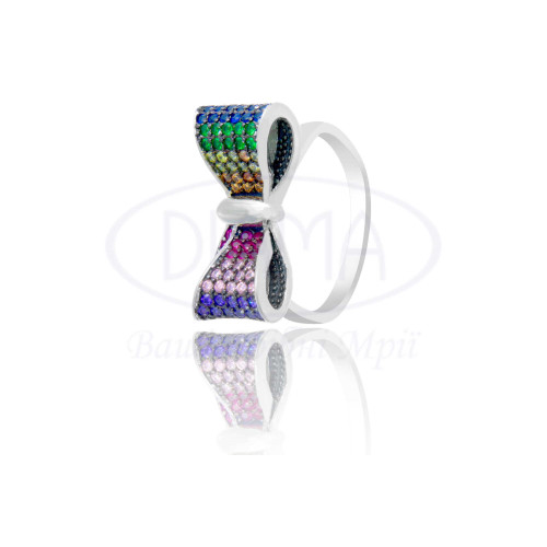 Срібна каблучка з різнокольоровим цирконом у формі банта. Срібло 925 проби, покрите родієм.