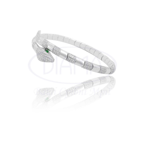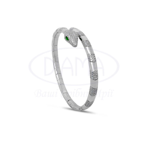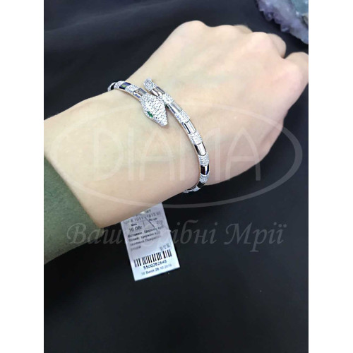 Срібний браслет у формі змії з білим та зеленим цирконом. Срібло 925 проби, покрите родієм. Ширина - 4,9 мм.