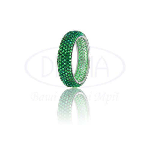 Срібна каблучка з зеленим цирконом. Срібло 925 проби, покрите родієм. Ширина 5,5 мм, 7 рядів циркону.