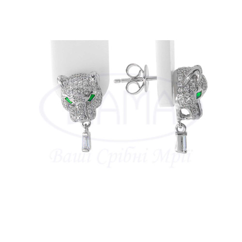 Сережки срібні у формі Пантери з білим та зеленим цирконом. Срібло 925 проби, покрите родієм. Розмір головного елементу сережки 10х12 мм. У комплекті каблучка та сережки.