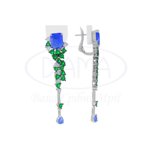 Сережки срібні з різнокольоровим цирконом, у формі квадрата. Срібло 925 проби, покрите родієм. Висота сережки 60 мм, ширина сережки 15 мм.