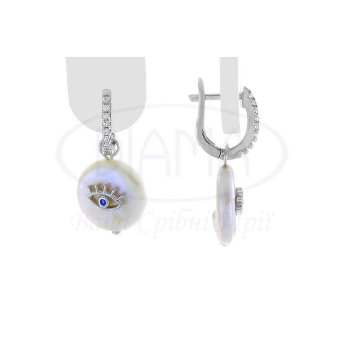 Срібні сережки з білим Перламутром, білим та синім цирконом у формі круга, із зображенням ока. Срібло 925 проби, покрите родієм. Діаметр круга 14 мм.