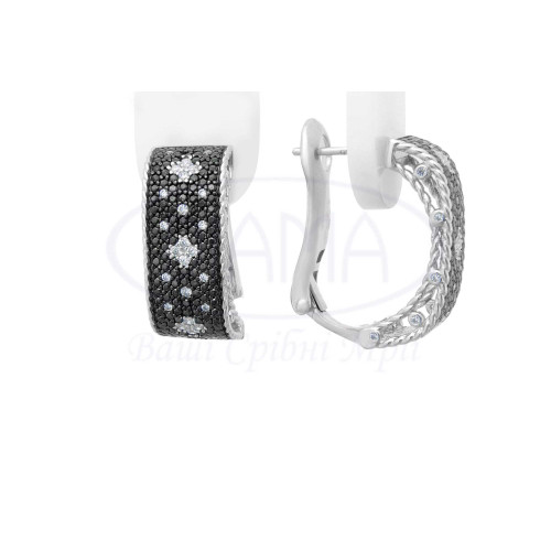 Срібні сережки з чорним та білим цирконом. Срібло 925 проби, покрите родієм. В наборі присутні каблучка та сережки.