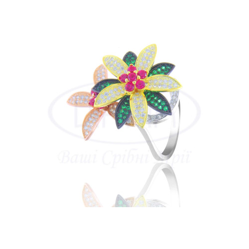 Каблучка срібна у формі квітки з білим та малиновим цирконом. Срібло 925 проби, покрите родієм, а також жовтою та червоною позолотою.