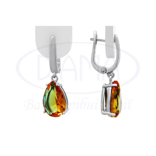 Срібні сережки в формі краплі. Срібло 925 проби, покрите родієм. Вставка Султаніт (камінь, який змінює свій колір в залежності від освітлення). Може бути зеленим, жовтим, малиновим або яскраво помаранчевим. В наборі присутні каблучка, сережки та підвіска. Розмір від 9×12 мм до 10×14 мм