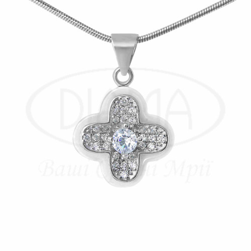 Підвіска срібна з білою керамікою та цирконом у формі "Клевер". Срібло 925 проби, покрите родієм. В наборі присутні каблучка, сережки та підвіска.