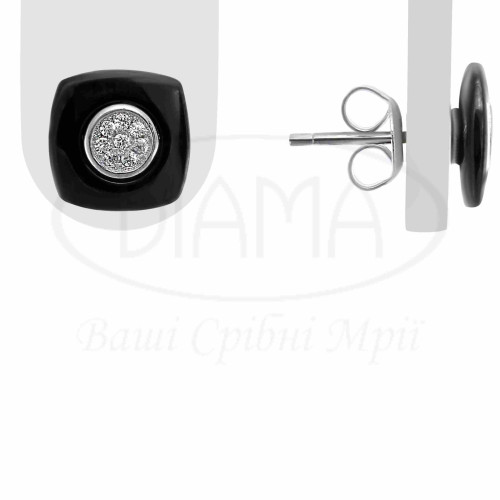 Сережки срібні з чорною керамікою у формі квадрату та невеликим колом, в якому розміщені камінці білого циркону. Срібло 925 проби, покрите родієм.