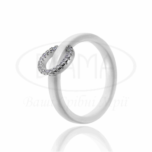 Каблучка з білої кераміки, на якій розташована срібна фігурка у формі кола з камінцями білого циркону. Срібло 925 проби, покрите родієм.