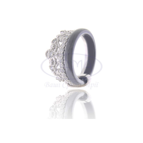 Каблучка срібна в формі корони з чорною ювелірною керамікою та білим цирконом. Срібло 925 проби, покрите родієм.