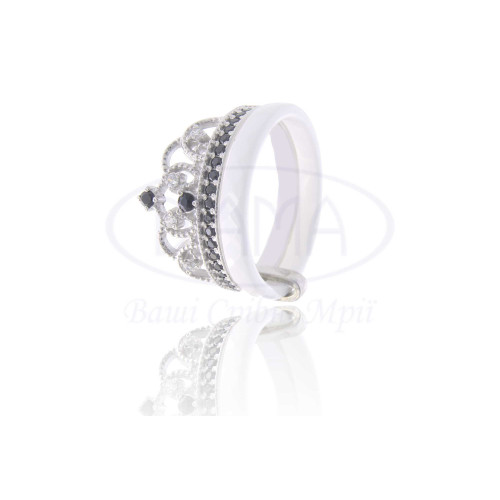 Срібна каблучка у формі корони з білою граненою керамікою та цирконом білого та чорного кольору. Срібло 925 проби, покрите родієм.
