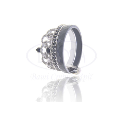 Срібна каблучка у формі корони з чорною граненою керамікою та цирконом білого і чорного кольору. Срібло 925 проби, покрите родієм.