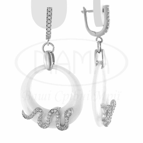 Сережки срібні з білою керамікою, на якій закріплена змія з білим цирконом. Срібло 925 проби, покрите родієм.