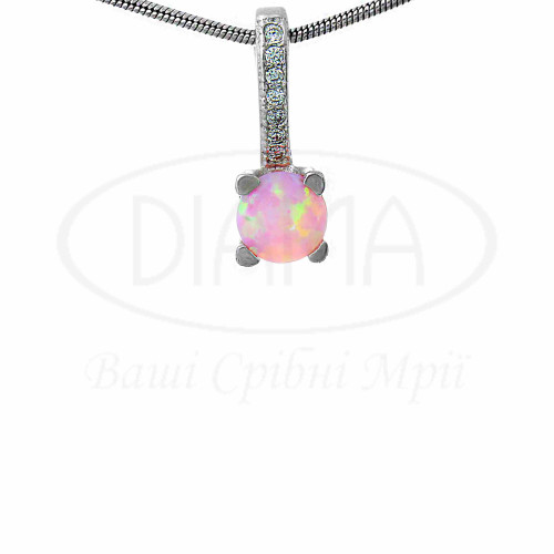 Срібна підвіска з рожевим опалом та білим цирконом. Срібло 925 проби, покрите родієм. Комплект складається з каблучки, підвіски та сережок.