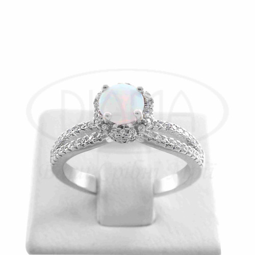 Срібна каблучка з білим опалом та білим цирконом. Срібло 925 проби, покрите родієм. Комплект включає в себе каблучку та сережки.
