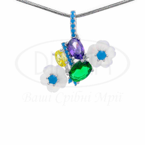 Срібна підвіска з кольоровим цирконом та перламутром. Срібло 925 проби, покрите родієм. Комплект виконаний в стилі Роберто Браво, у формі квітів. Складається з підвіски та сережок.