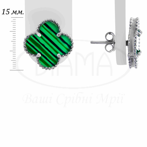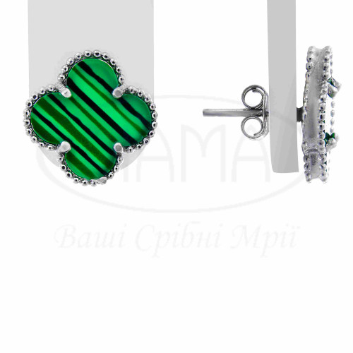 Срібні сережки з Малахітом. Срібло 925 проби, покрите родієм. Виготовлені в формі "Клевер". Розмір головного елементу 15 мм.