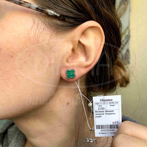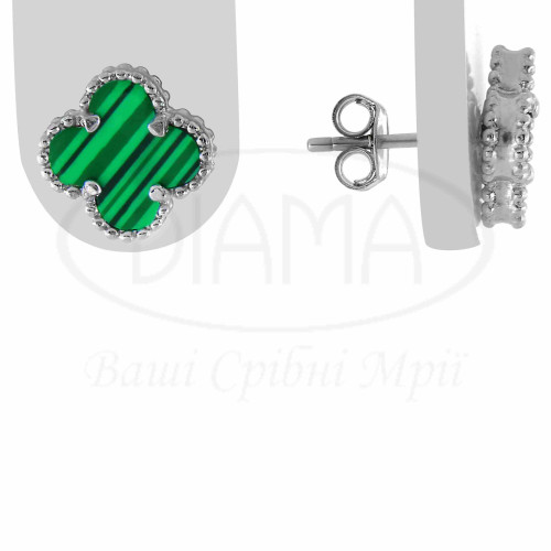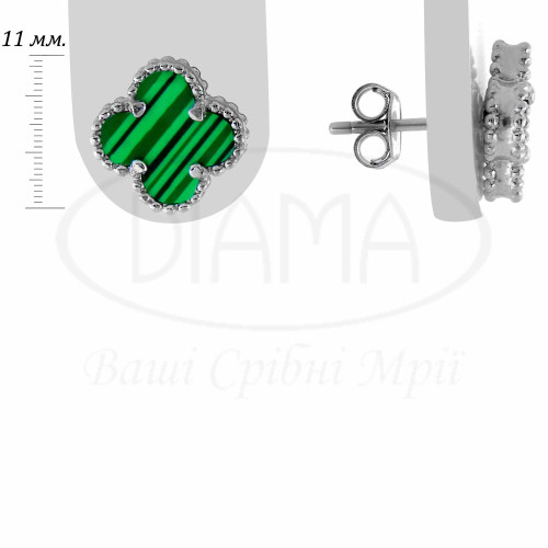 Срібні сережки пусети з Малахітом. Срібло 925 проби, покрите родієм. Виготовлені в формі Конюшини. Розмір головного елементу - 11-12 мм.