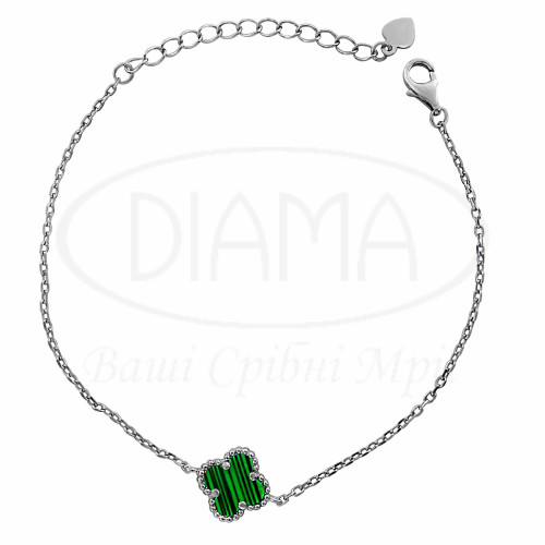 Браслет срібний з Малахітом. Срібло 925 проби, покрите родієм. Браслет виготовлено в формі "Клевер". В наборі присутні сережки, каблучка, браслет, кольє та підвіска. Розмір головного елементу 11 мм.